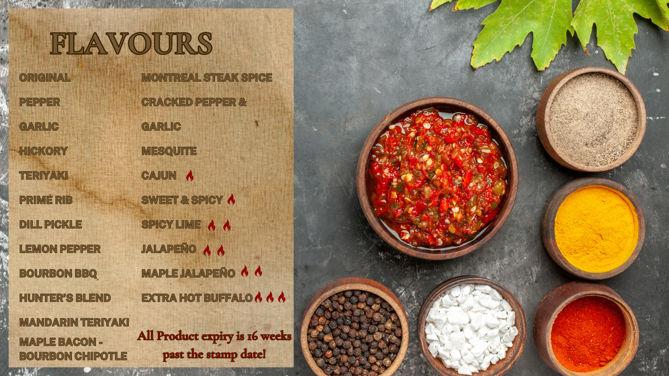 Original, Pepper, Garlic, Hickory, Mesquite, Teriyaki, Lemon Pepper, Bourbon BBQ, Hunter's Blend, Mandarin Teriyaki, Dill Pickle, Maple Bacon Bourbon Chipotle, Montreal Steak Spice, Black Pepper & Garlic, Cajun, Prime Rib, Sweet & Spicy, Spicy Lime, Jalapeño, Maple Jalapeño, Extra Hot Buffalo Jerkey expiry is 16 weeks past stamp date